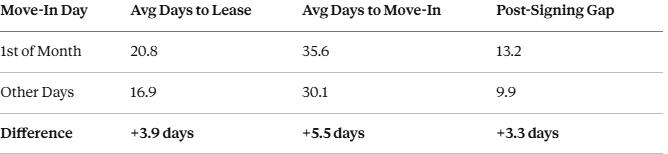 Properties with 1st-of-month move-ins sit vacant 5.5 days longer on average. And 3.3 of those days come after the lease is already signed, pure waiting time while a rent-ready unit generates zero income.