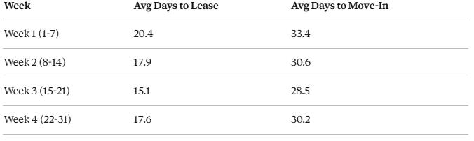 Week 3, the 15th through 21st, delivers the fastest leasing times at 15.1 days on average. Week 1 is the slowest at 20.4 days. If you're structuring lease terms or negotiating move-in dates, aim for that third week sweet spot.