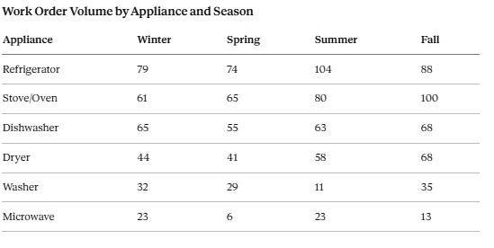 Dishwashers are the most consistent appliance across seasons, ranging from 55 to 68 work orders per quarter. People use their dishwasher the same amount regardless of the time of year, so there's no real seasonal driver there.